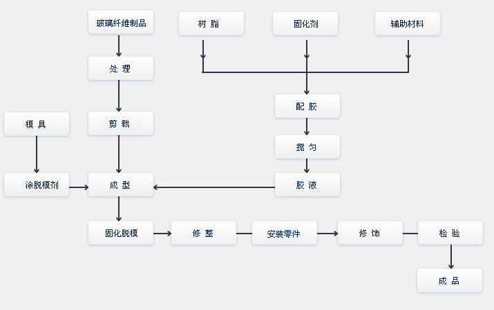 手糊成型法又稱接觸成型法,其成型過程為:加有固化劑的樹脂混合料和玻璃纖維制品手工逐層鋪放,在涂有脫模劑的模具上,浸膠并排除氣泡,層合至確定厚度,然后固化形成制件。